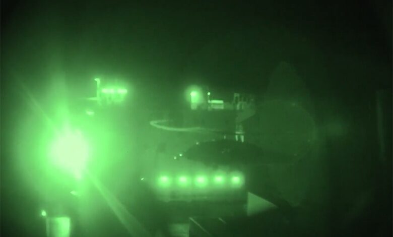 Američki marinci helikopterom napuštaju amfibijski jurišni brod USS Tripoli (LHA 7) i prelaze preko Arapskog mora kako bi se ukrcali i zauzeli mali brod Touska.
