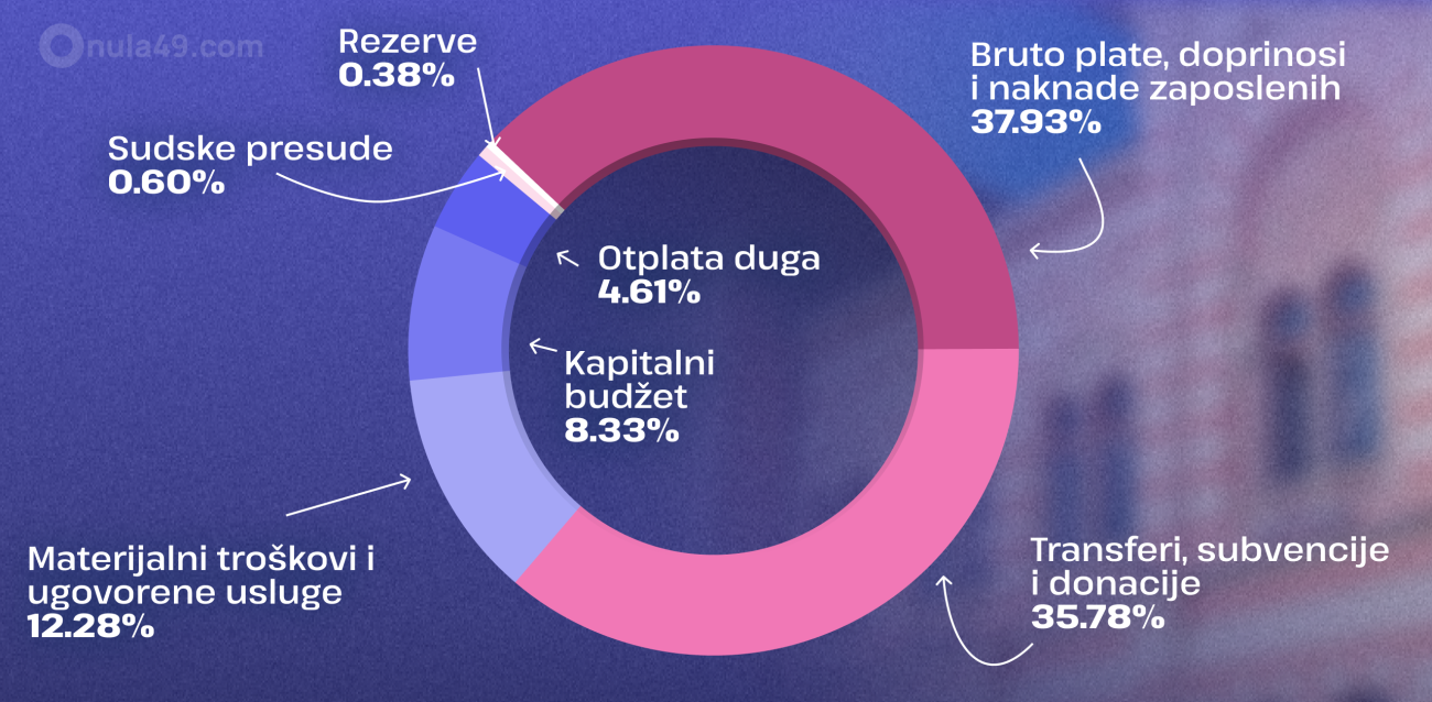 Vrlo važan podatak je i taj, da 95% budžeta su zakonom predviđene obaveze, potpisani ugovori i druge ranije preuzete obaveze, što znači da u ovakvoj strukturi samo 5% budžeta ostaje za kreiranje novih programa i projekata ili za uvećanje kapitalnog i razvojnog budžeta. Kada detaljnije uđemo u analizu, vidjećemo da od gore navedenog iznosa, sredstva su raspoređena na sljedeći način:
