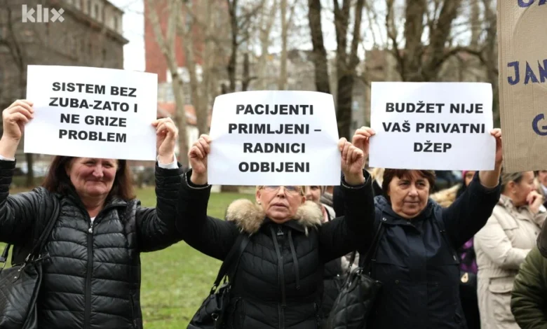 Sindikat radnika u zdravstvu Kantona Sarajevo (KS) održao je danas mirni protest ispred zgrade kantonalne Vlade zbog neisplaćene plate i stanja na Stomatološkom fakultetu.